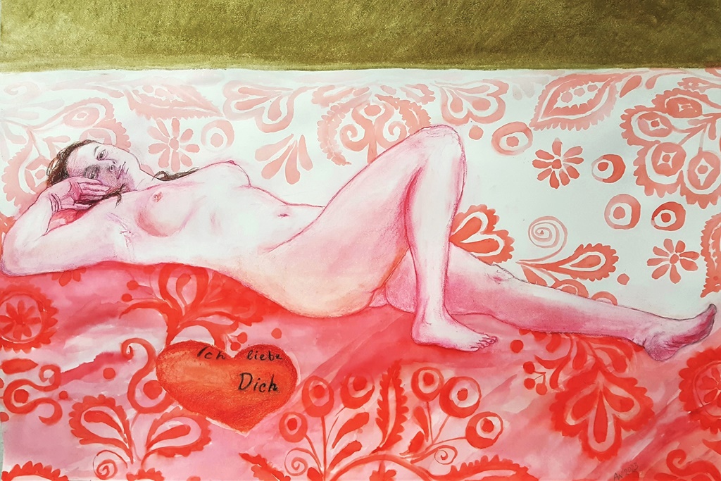 J.-Zum Valentinstag (A2, Aquarell/Buntstift, 2023, verkauft)