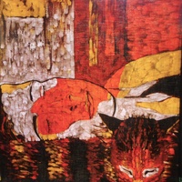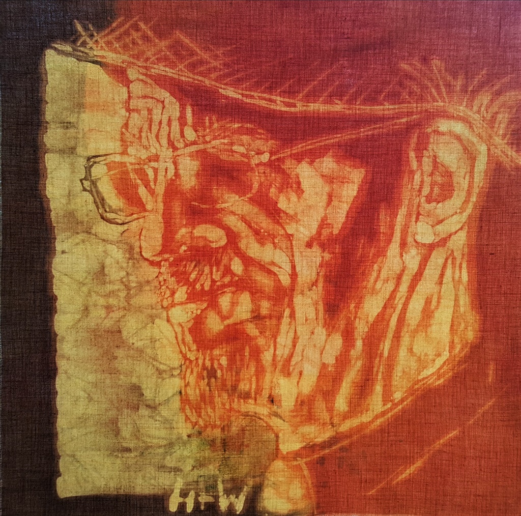 Selbst mit Kater (75x75, Batik, 2018, verkäuflich 300 €)